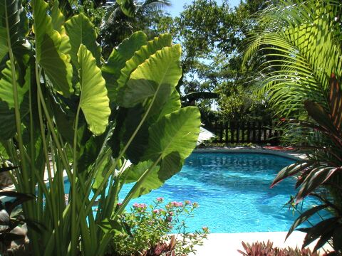 Hotel am Hügel über dem Ort in einem tropischen Garten gelegen. Am