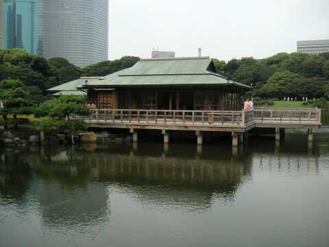 Mit der U-Bahn bin ich dann durch die halbe Stadt zur Kaiserlichen Sommervilla in mitten eines Parks am Meer gefahren. Zumindest lag der Park einmal am Meer. Inzwischen hat sich durch Landaufschüttungen der Stadtteil Harumi vor den Ozean geschoben. Dieser Park ist ein typischer feudaler Landschaftspark aus der Edo Zeit mit weiten offenen Rasenflächen und Teichen.