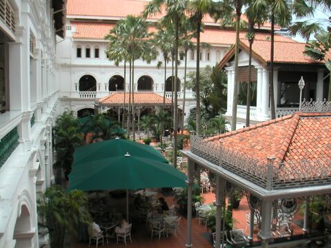 Der Ausblick von der Terrasse der Long Bar auf einen weiteren Innenhof. In der Long Bar wurde 1915 der Singapore Sling kreiert. | ![]() |