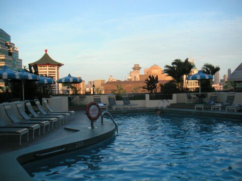 Nachdem ich gestern nur zum arbeiten gekommen bin, hatte ich heute zumindest noch kurz Zeit, vor Sonnenuntergang eine Runde im Hotelpool schwimmen zu gehen. | |||||
