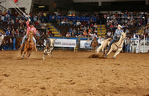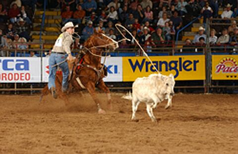 TEAM ROPING Dieser Wettbewerb ist für Lassowerfer. Zwei Cowboys reiten einem Rind hinterher. Der erste muss das Lasso um den Kopf werfen. Wenn das Viech dadurch die Richtung ändert, wirft der zweite sein Lasso so unter die Hinterbeine, dass es praktisch zwischen die beiden Lassos gespannt wird. Auch hier wird die Zeit gemessen und die schnellsten gewinnen. |