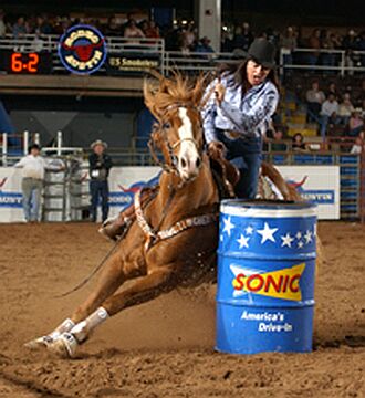 BARREL RACING Bei dieser Übung ging es eigentlich nur darum, so schnell wie möglich um drei Tonnen zu reiten, die in der Arena verteilt waren. Wenn man eine Tonne umwirft gibt es für jede Tonne 5 Sekunden extra. |