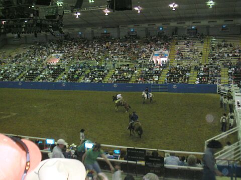 Tie-Down Roping Bei diesem Wettbewerb ging es wieder um die schnellste Zeit. Der Cowboy muss einem Rind hinterher reiten und mit einem Lasso stoppen. Sobald das Lasso über den Kopf geflogen ist, bleibt das Pferd stehen und das Rindviech fliegt fast rückwärts durch die Luft. Für die besten Zeiten muss der Cowboy schon auf dem Vieh knien, bevor es wieder aufstehen kann. Die Zeit wird nämlich erst gestoppt, wenn er noch drei Beine verschnürt hat. Und das ist das schwierigste an der ganzen Übung und klappt wohl am besten, wenn das Rind noch von der abrupten Vollbremsung geschockt ist. Die schnellsten haben die ganze Übung in unter 9 Sekunden geschafft. |