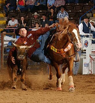 STEER WRESTLING Bei diesem Wettbewerb wird ein Rindvieh losgejagt und der Cowboy mit einem Pferd hinterher. Er wirft sich dann vom Pferd aus auf das arme Rind und muss es umwerfen. Sobald es auf dem Rücken liegt wird die Zeit gestoppt. Der schnellste gewinnt. |