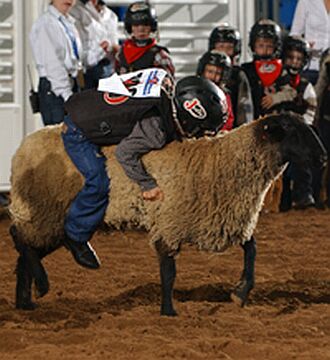 MUTTON BUSTIN Das Schafe reiten dient eher zur allgemeinen Belustigung. Hier werden kleine Kinder auf ein Schaf gesetzt und das Schaf in die Arena gejagt. Die kleinen klammern sich so in der Wolle fest, dass sie sogar an den Viechern hängen bleiben, wenn die sich vor lauter Verzweiflung im Dreck wälzen. Zum schreien. |